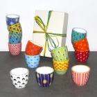 Farbenfrohe Keramik-Eierbecher für ihren Tisch! Auf Wunsch auch kostenlos im Geschenkkarton geliefert.